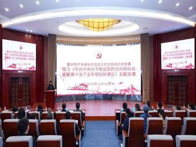 2025年11月23日上午,为充分调动全社会投身中国式现代化建设的积极性主动性创造性,激发基层党员同志在科技创新赋能产业创新工作中的先锋模范作用,市产学研合作促进会党支部书记陈洁在重庆两江新区金山大厦会议厅,以“学习领会《中共中央关于制定国民经济和社会发展第十五个五年规划的建议》精神”为题,为150余名企业基层科技工作者讲了一堂专题党课。